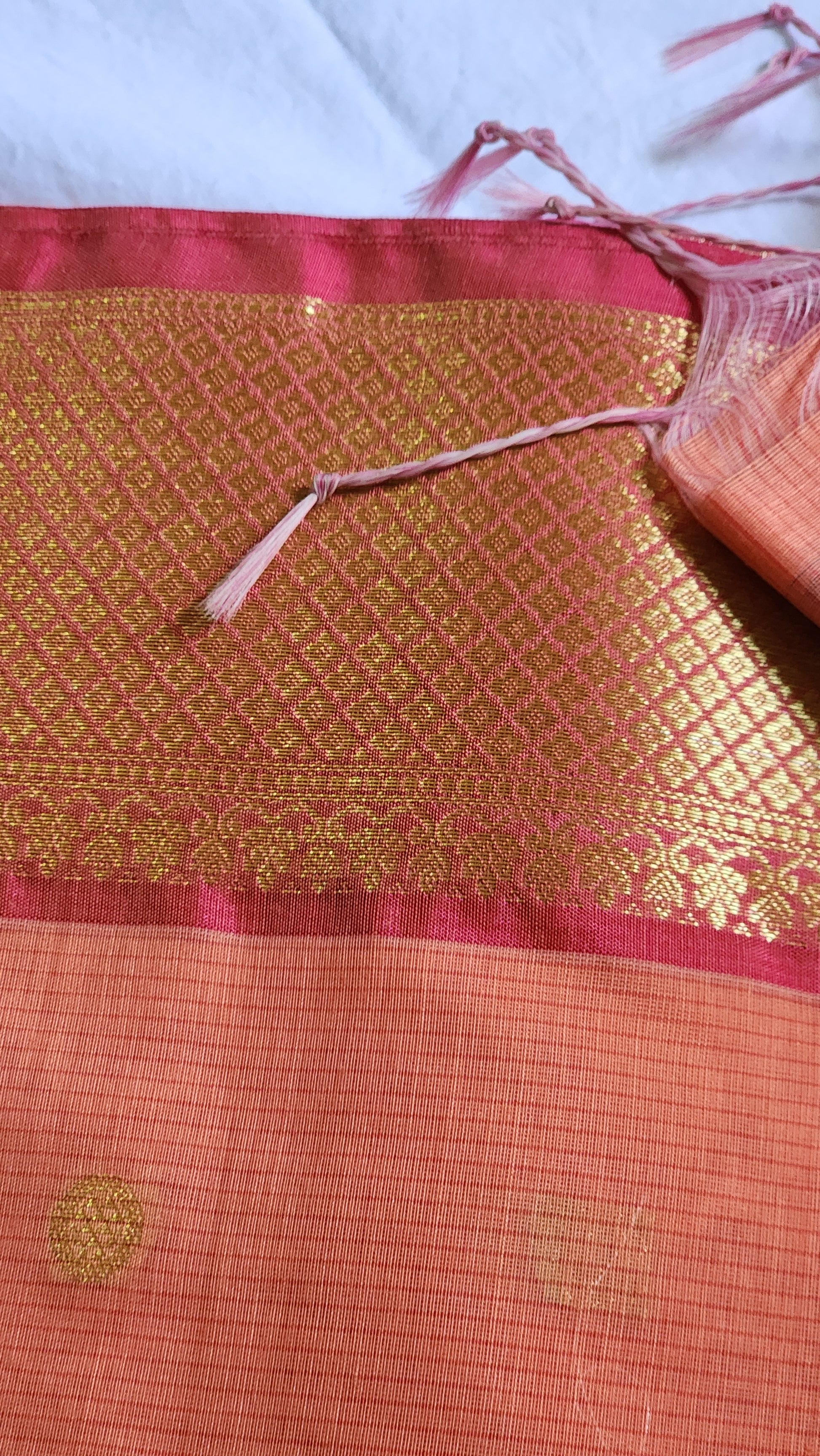 Peach and pink combination, this is art silk cotton saree. its has running blouse fabric