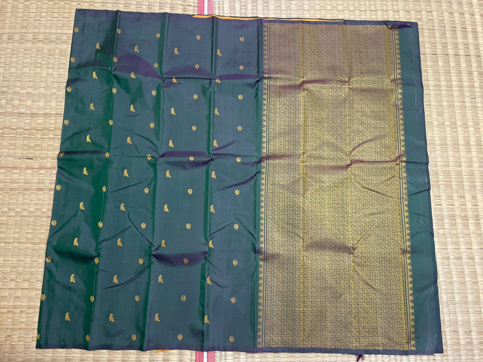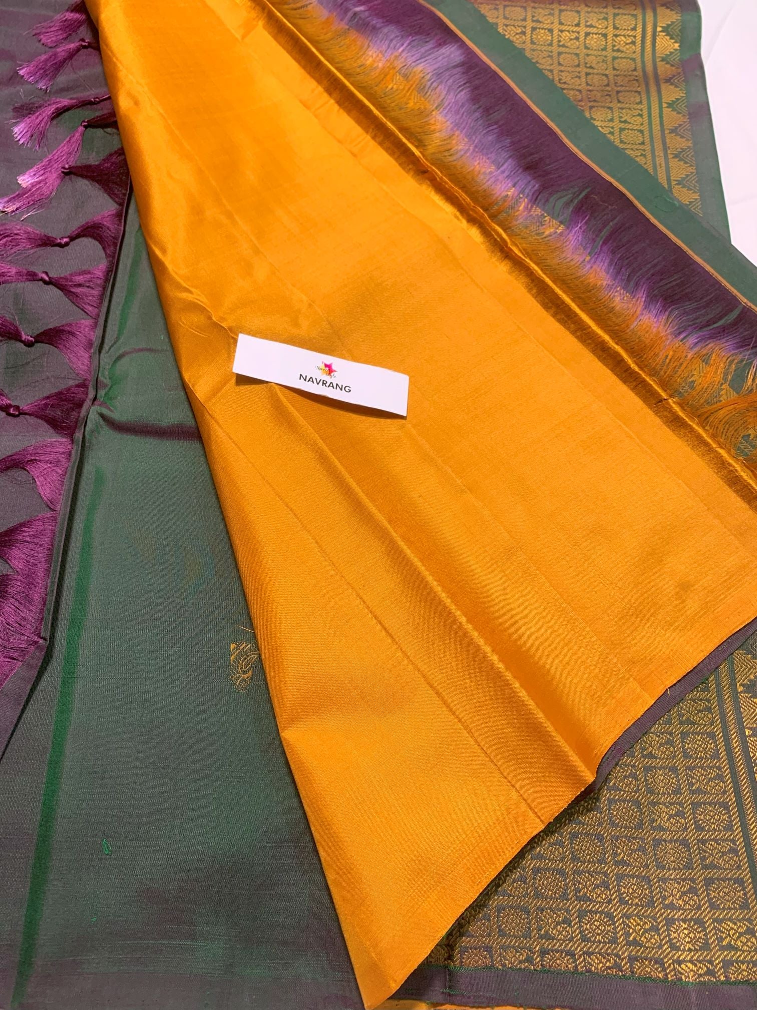 Expertly crafted, the Dual Shade no Zari Kanjivaram Saree features a stunning shade of dark green with a beautiful peacock motif. Made from pure silk, this handcrafted saree is perfect for all occasions and comes with a contrast blouse (yellow). Elevate your wardrobe with this no zari Kanchipuram saree.
