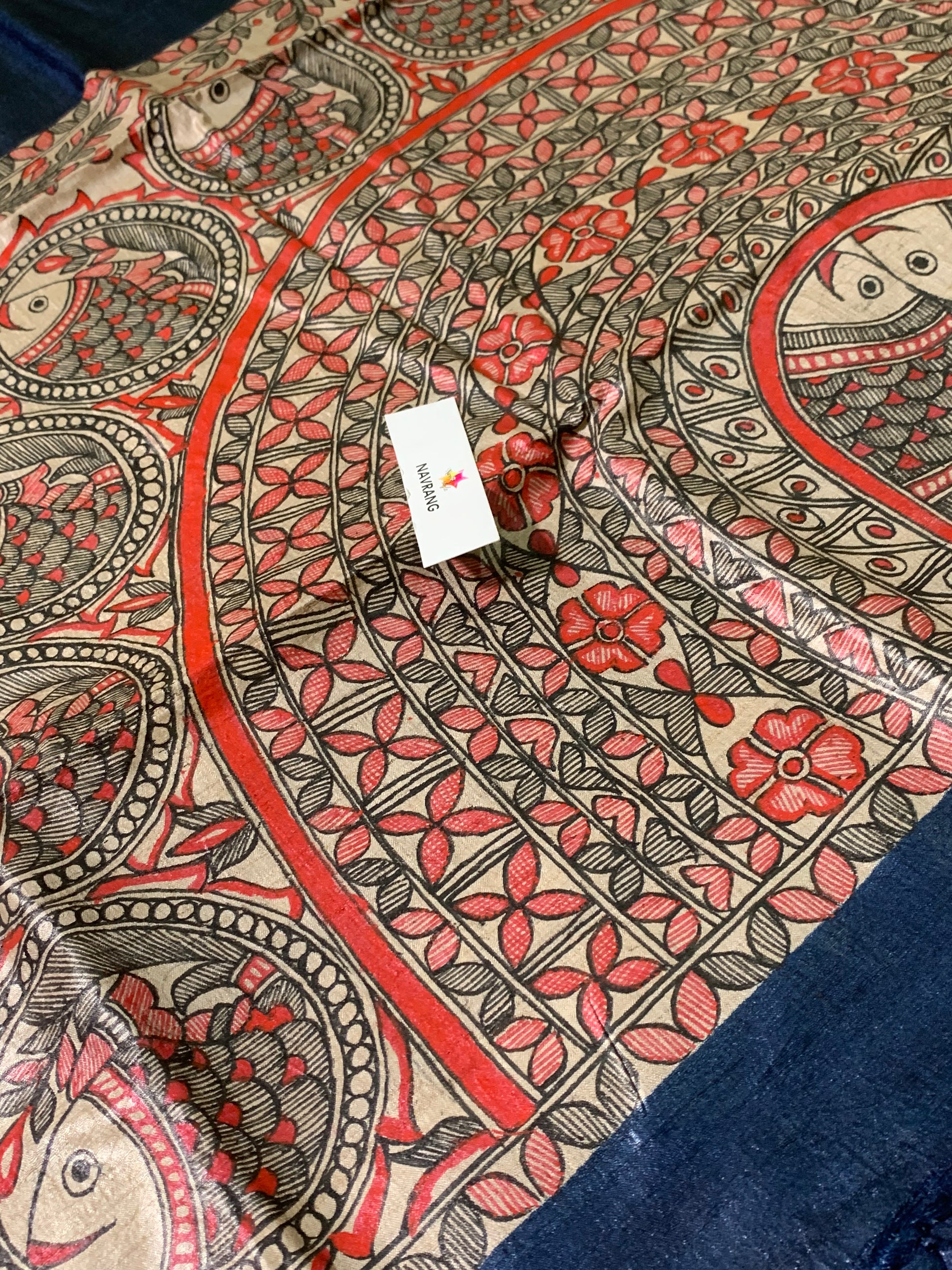 Handpainted Madhubani Tussar silk Saree with Fish border