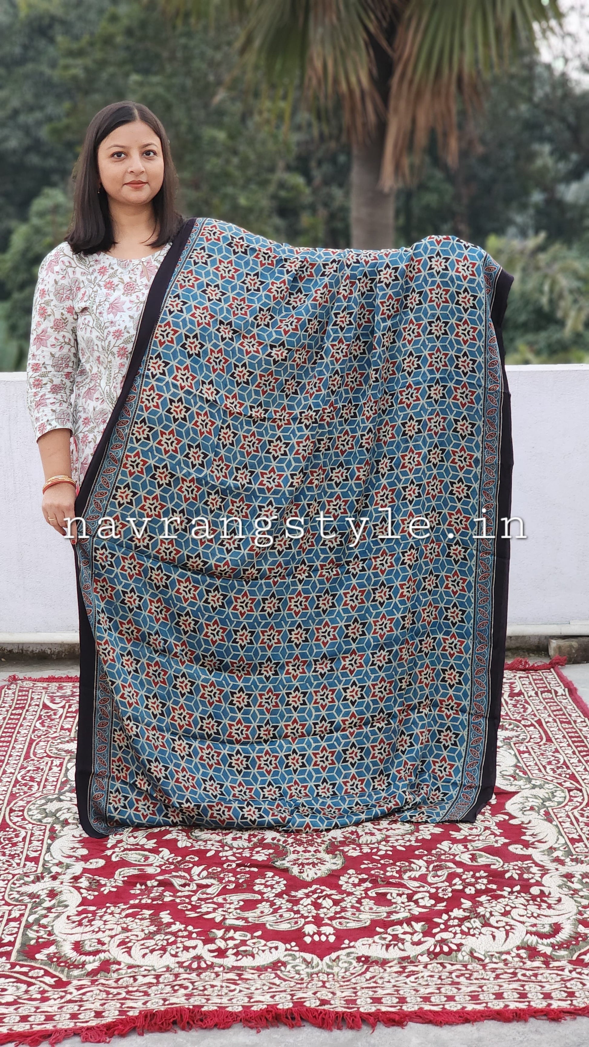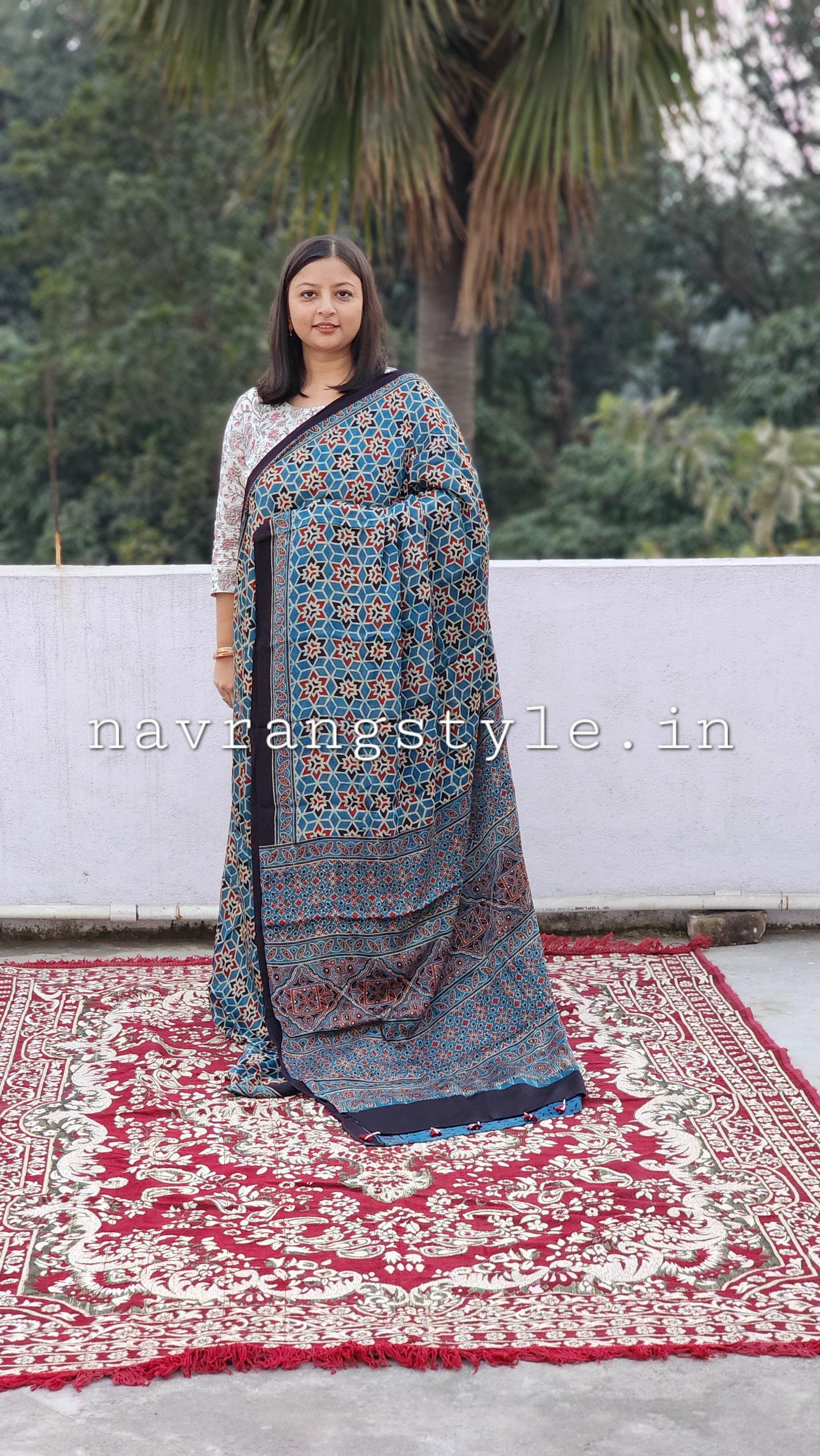 Step into timeless elegance with this exquisite Ajrakh handblock-printed modal silk saree. Featuring a mesmerizing geometric star pattern in shades of blue, red, and black, this saree showcases the intricate artistry of traditional Ajrakh printing. The fine modal silk fabric ensures a soft, fluid drape, while the black border adds a bold contrast, enhancing its regal charm. Crafted with natural dyes, this saree is perfect for festivals, workwear, or special occasions, effortlessly blending heritage with contemporary grace.
