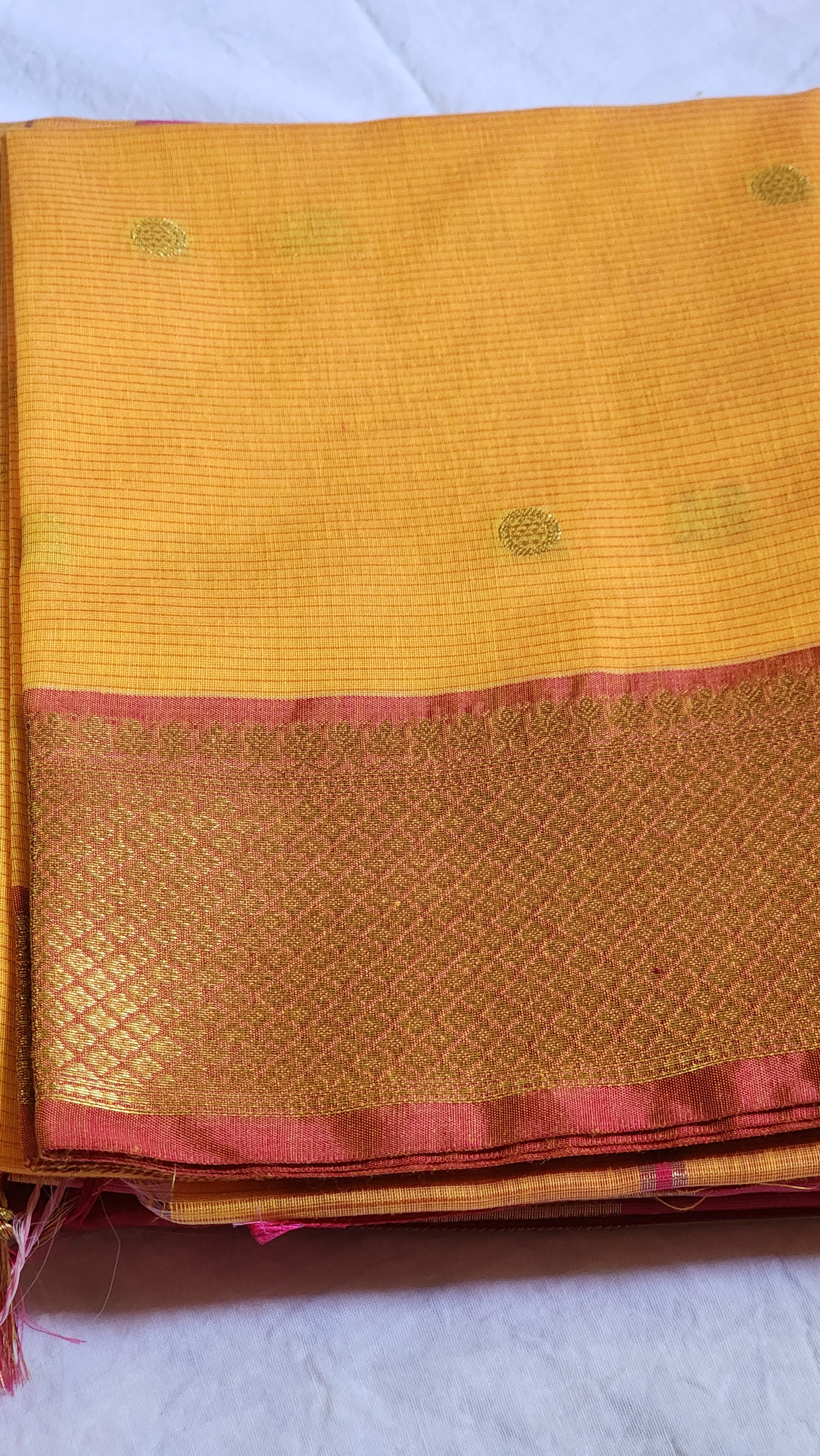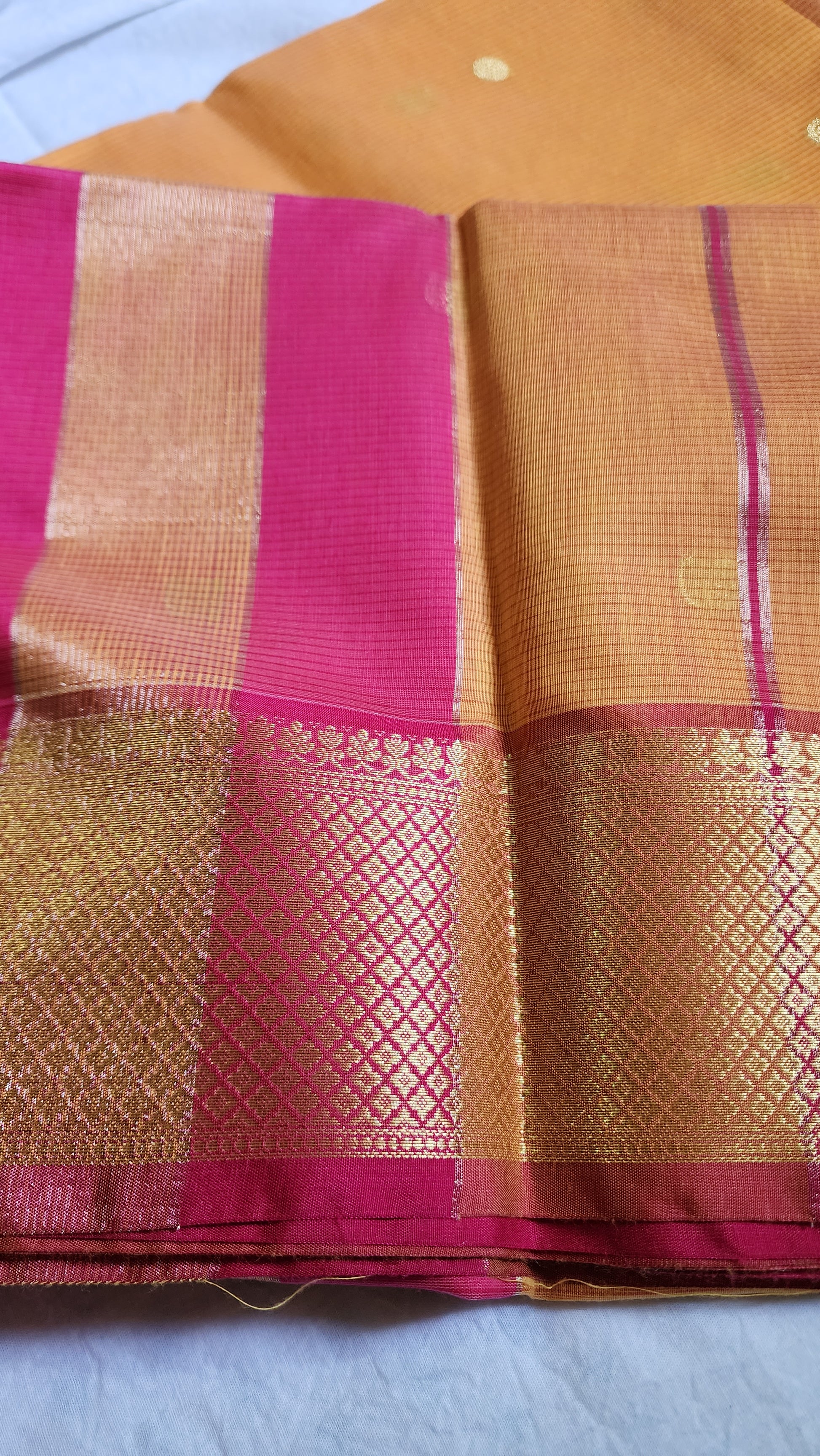 Orange and Pink combination, this is known as semi Maheshwari saree. This art silk cotton saree has running blouse fabric.