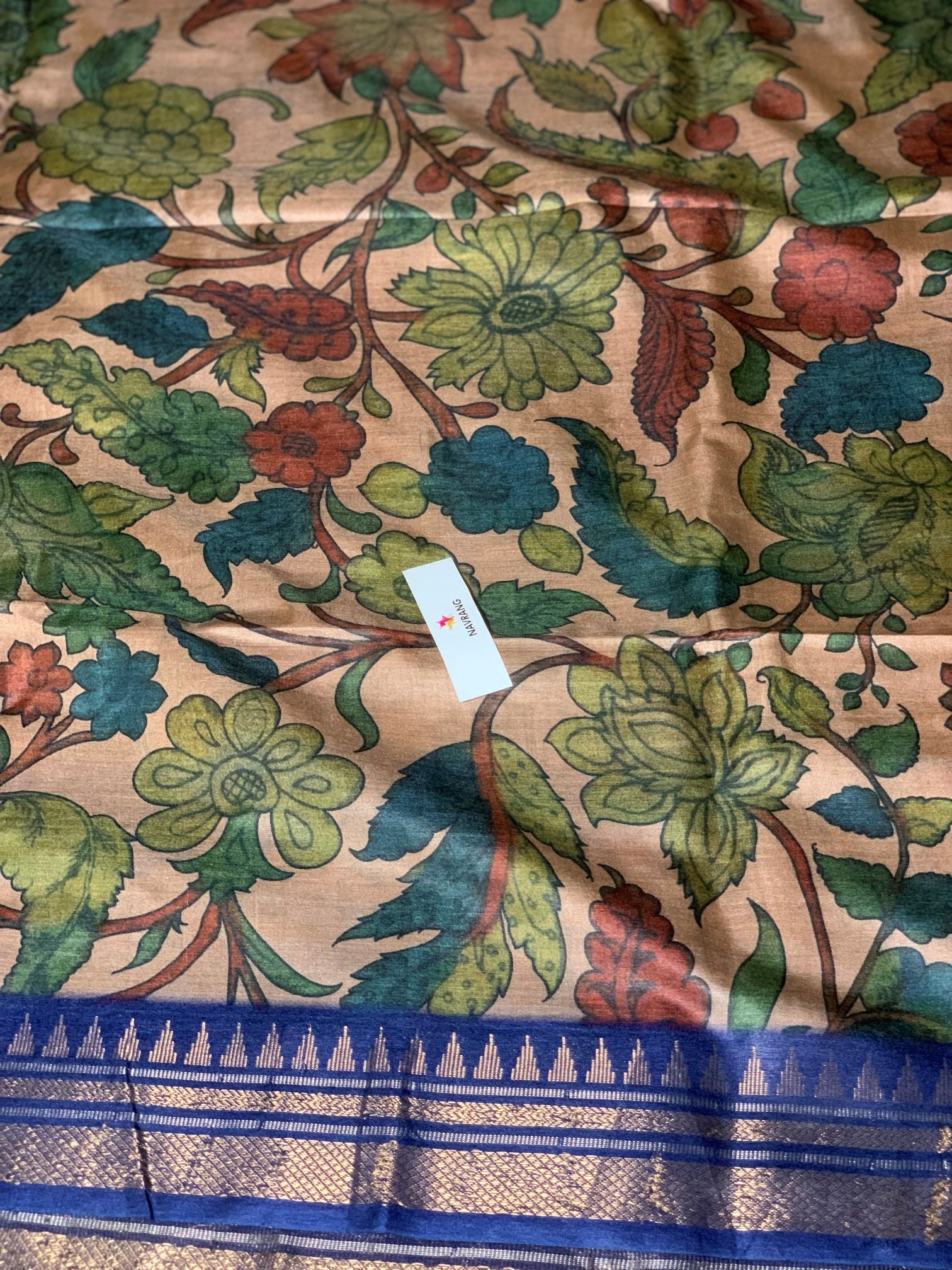 Navrangstyle's Execusite collection. Expertly crafted and inspired with traditional Indian Kalamkari art, our Printed Tussar silk saree boasts a soft, luxurious texture and elegant zari border. Paired with a running blouse fabric, this unique and classy piece is suitable for all ages.
