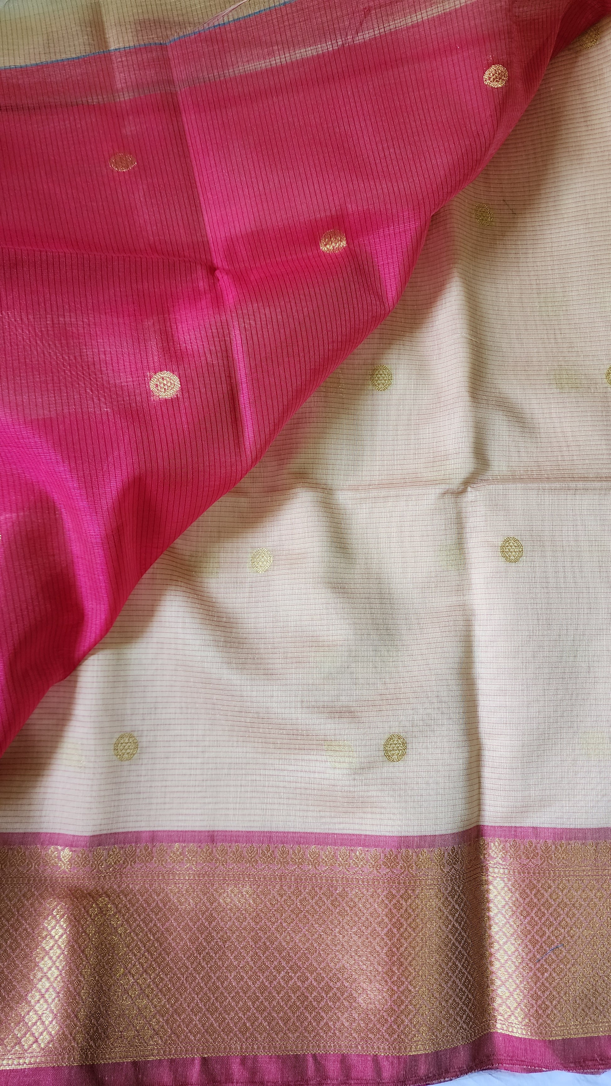 Off White and pink combination, this semi Maheshwari has beautiful shade of pink running blouse fabric.