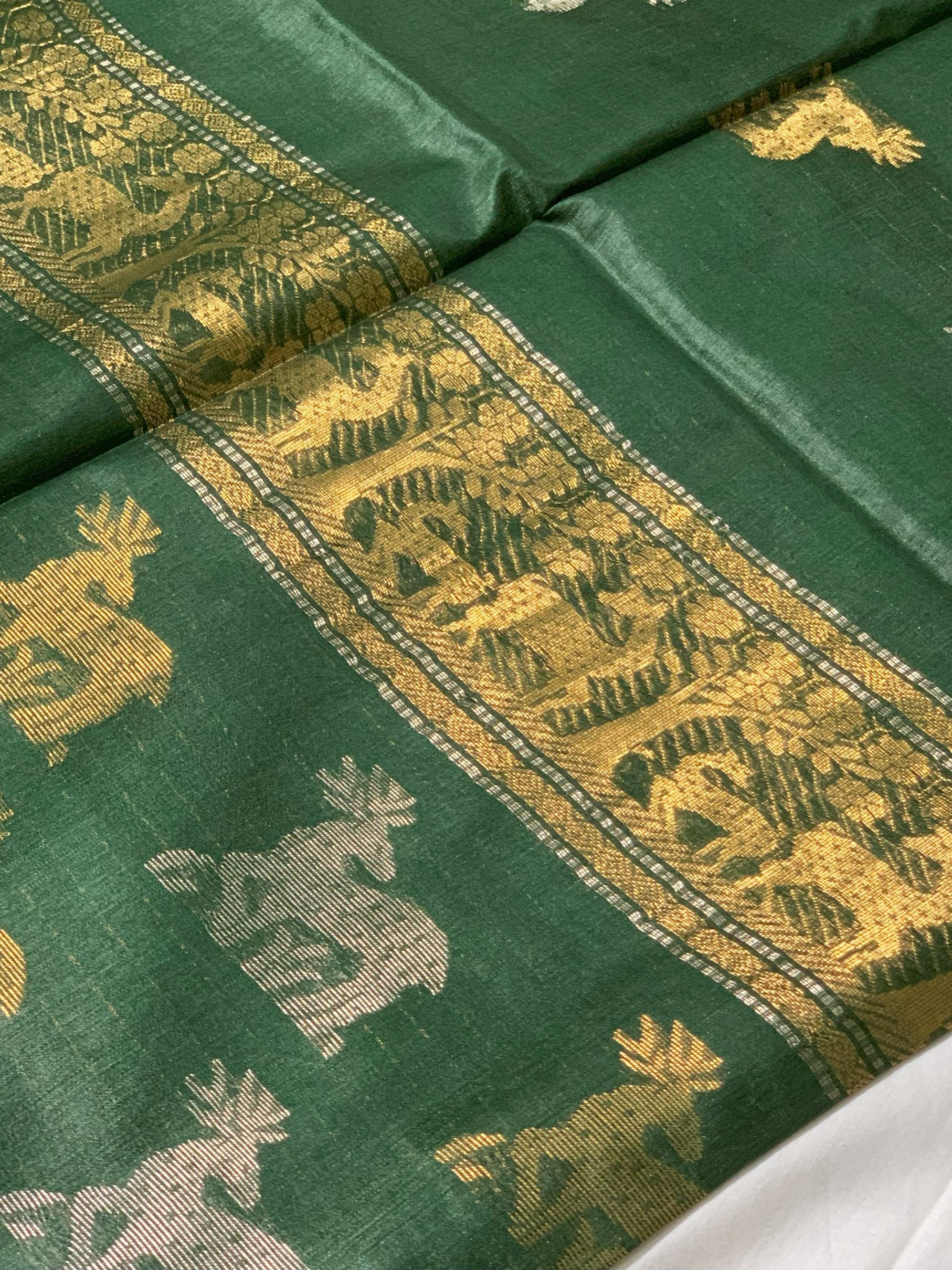 Expertly crafted with traditional techniques, this Tussar silk saree from the Navrangstyle collection showcases beautiful deer motifs in intricate woven zari work. A tribute to Indian heritage, this saree highlights the weaver's expertise and guarantees a stunning addition to any wardrobe. It is very soft and easy to drape. The Saree has running blouse fabric.