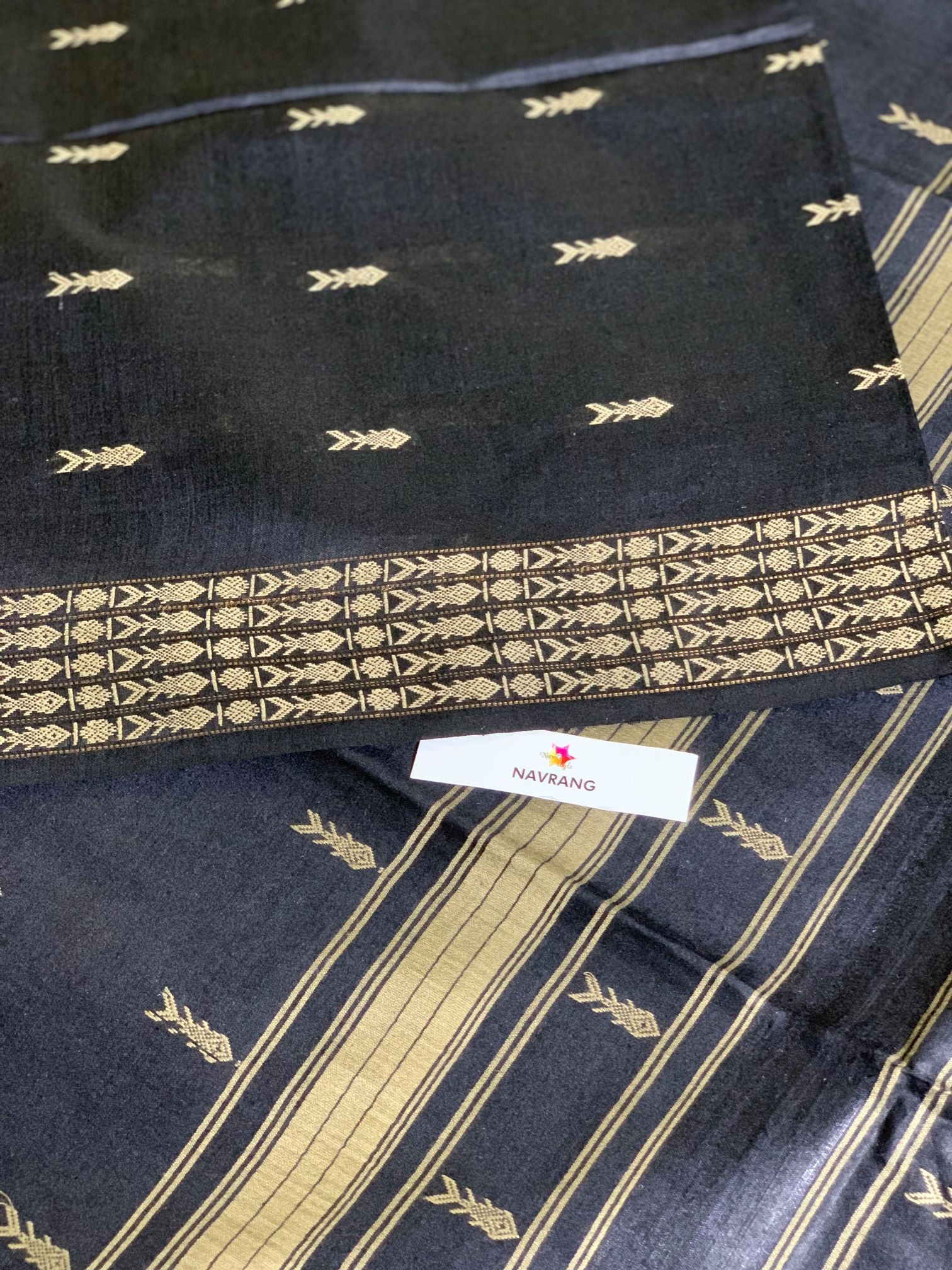 This handcrafted Tussar silk saree from the Navrangstyle collection showcases intricate woven fish motifs and exudes class in its black color. Made by skilled weavers, this saree is a masterpiece that captures the magic of weaving. Explore the weavers' art with this stunning saree. The Saree has running blouse fabric.